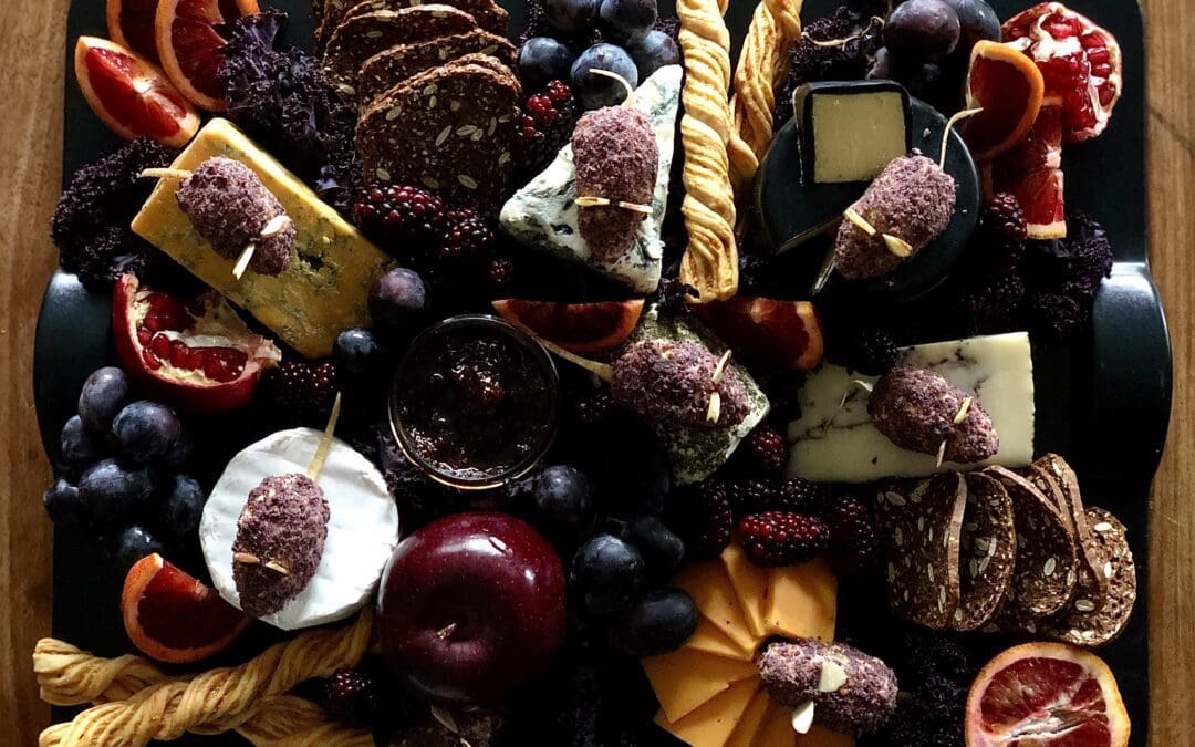 These little mice are the perfect addition to a grazing platter of cheese and fruit. For my Halloween-themed cheese board I started by choosing a colour scheme, then set out to find an assortment of cheeses that fit the black-white-orange theme that I had selected. Here’s a break down of my board: